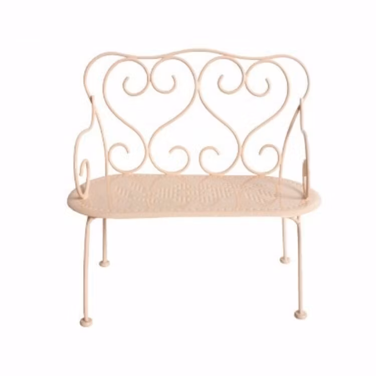 En romantisk og tidløs bænk i en dejlig pudderrosa farve, vil passe perfekt ind i dukkehuset. Eller hvorfor ikke på en fin hylde på børneværelset? Utroligt detaljeret produkt fuldstændig håndlavet af det populære firma Maileg. Mål: 20x20 cm Alder: Fra 3 år. Materiale: Metal