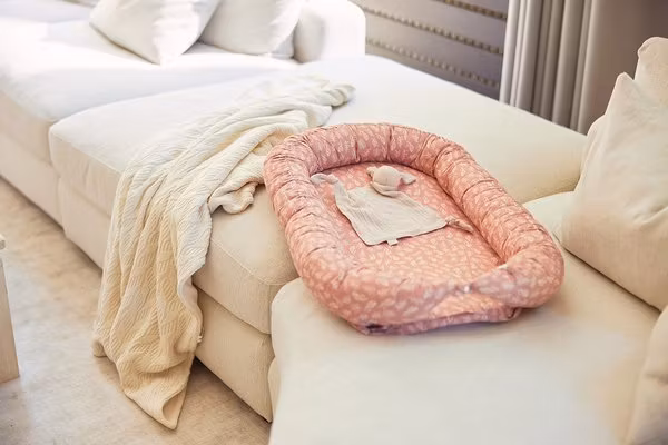 En super blød fyldning sikrer, at din baby ligger sikkert og behageligt. Babynest åbner og lukker nemt ved hjælp af en knap og kan også bruges som indlæg i tremmesengen eller barnevognen.