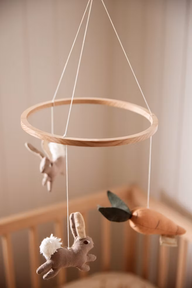 En smuk sengemobil med to søde kaniner og en lækker gulerod til hjemmets allermindste fra danske Filibabba!