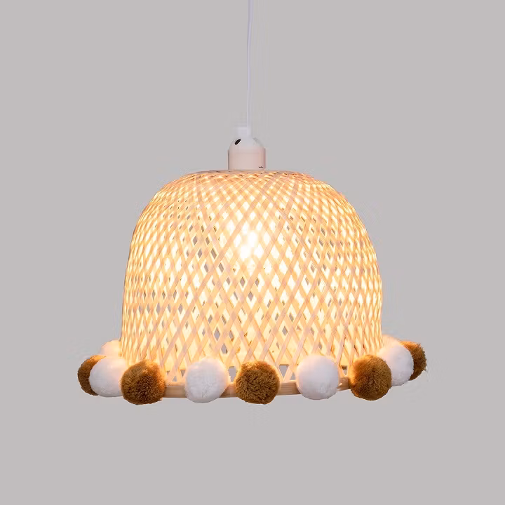 Skøn loftlampe i bambus med søde pomponer, der vil give børneværelset en særlig charme.