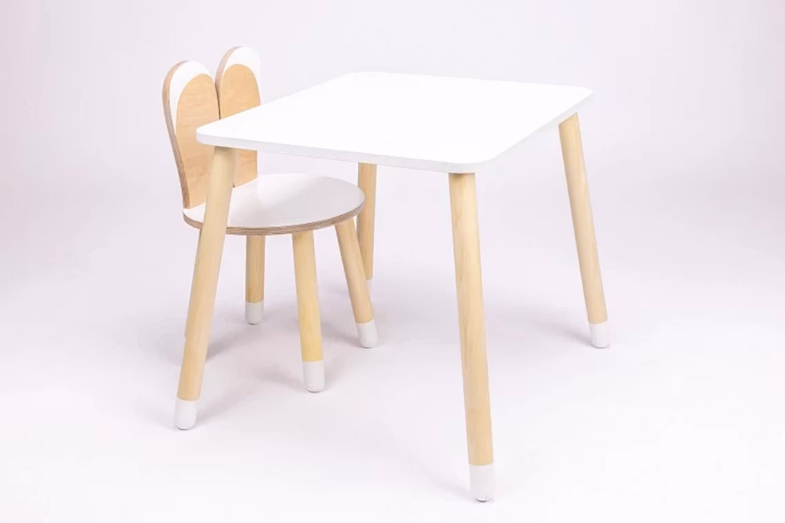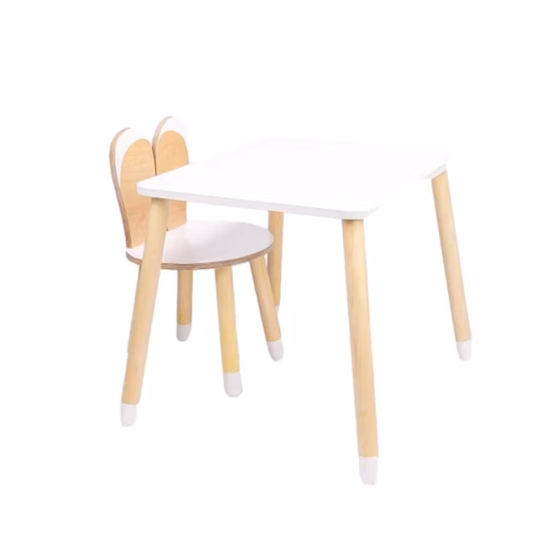 Et enestående og meget smukt Montessori møbelsæt indeholdende en stol med kaninører og et smukt tilhørende skrivebord.