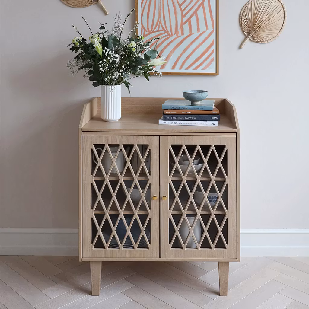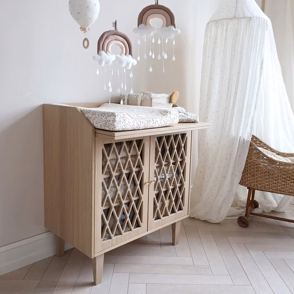 Et super flot og elegant puslebord til børneværelset fra danske Cam Cam. Puslebordet har dobbeltdør og to praktiske hylder.