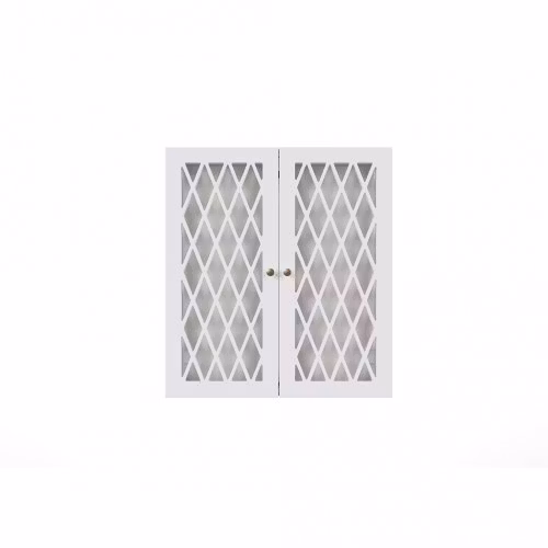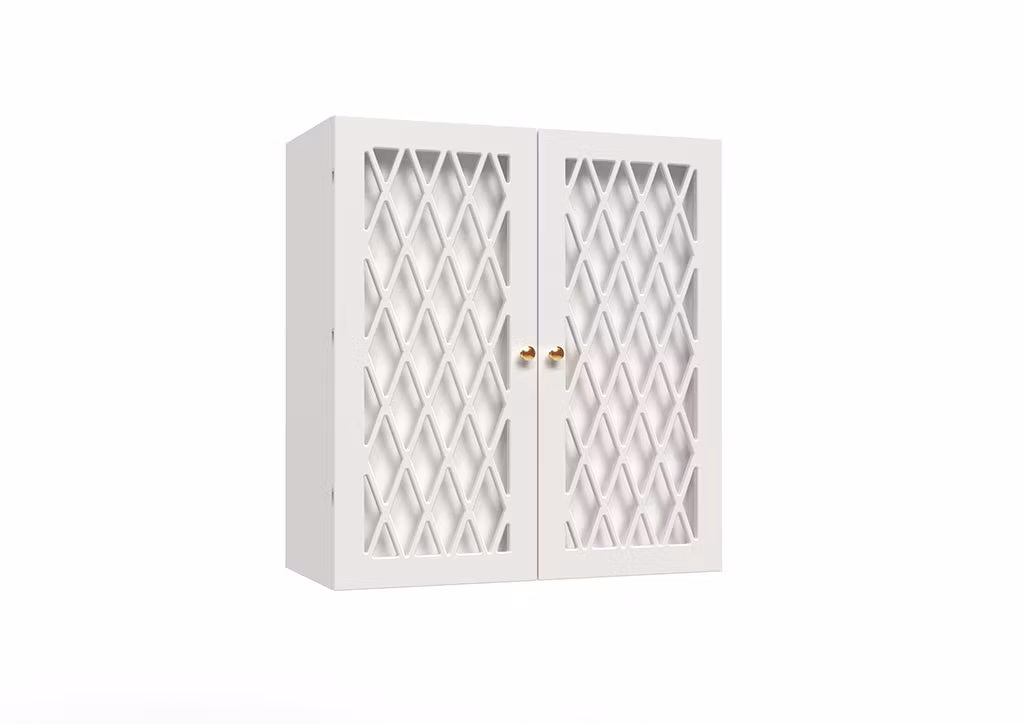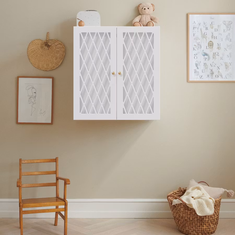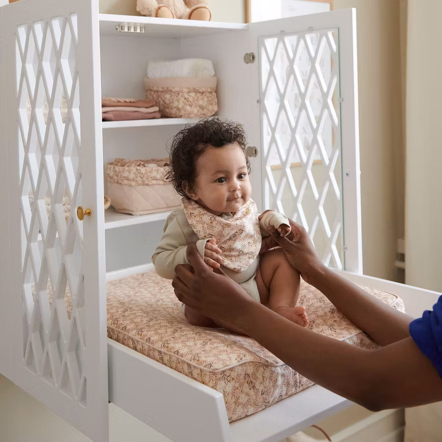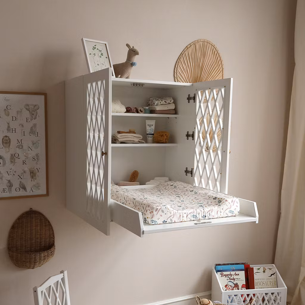 Skabet har dobbeltdør og praktiske hylder med plads til bleer og andet. Tilpasset til små rum, da puslebrættet foldes ned, når det er i brug og foldes op igen, når det ikke er i brug. Puslebordet kan senere bruges som overskab, da puslebordet nemt kan tages af, når bleskiftetiden er forbi.