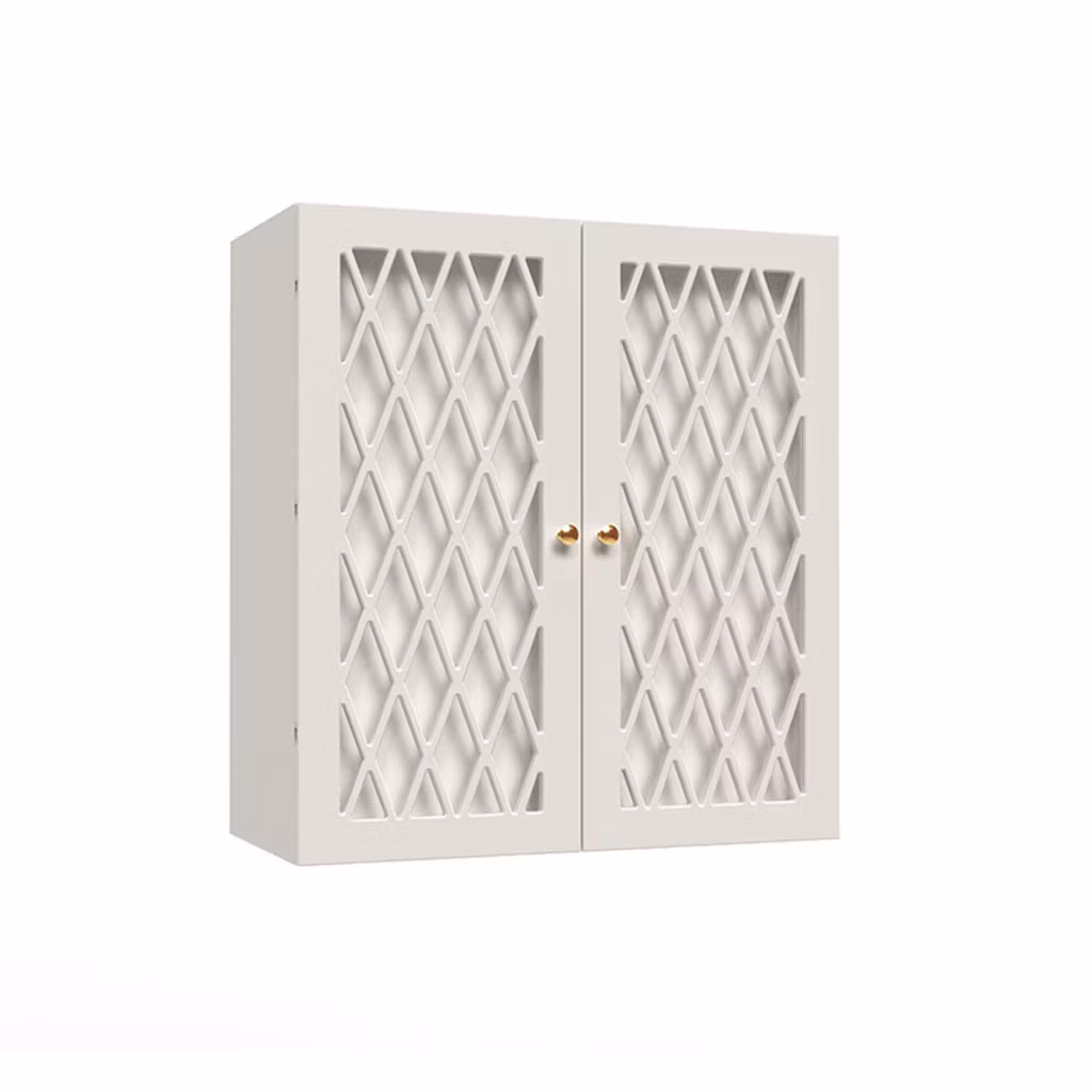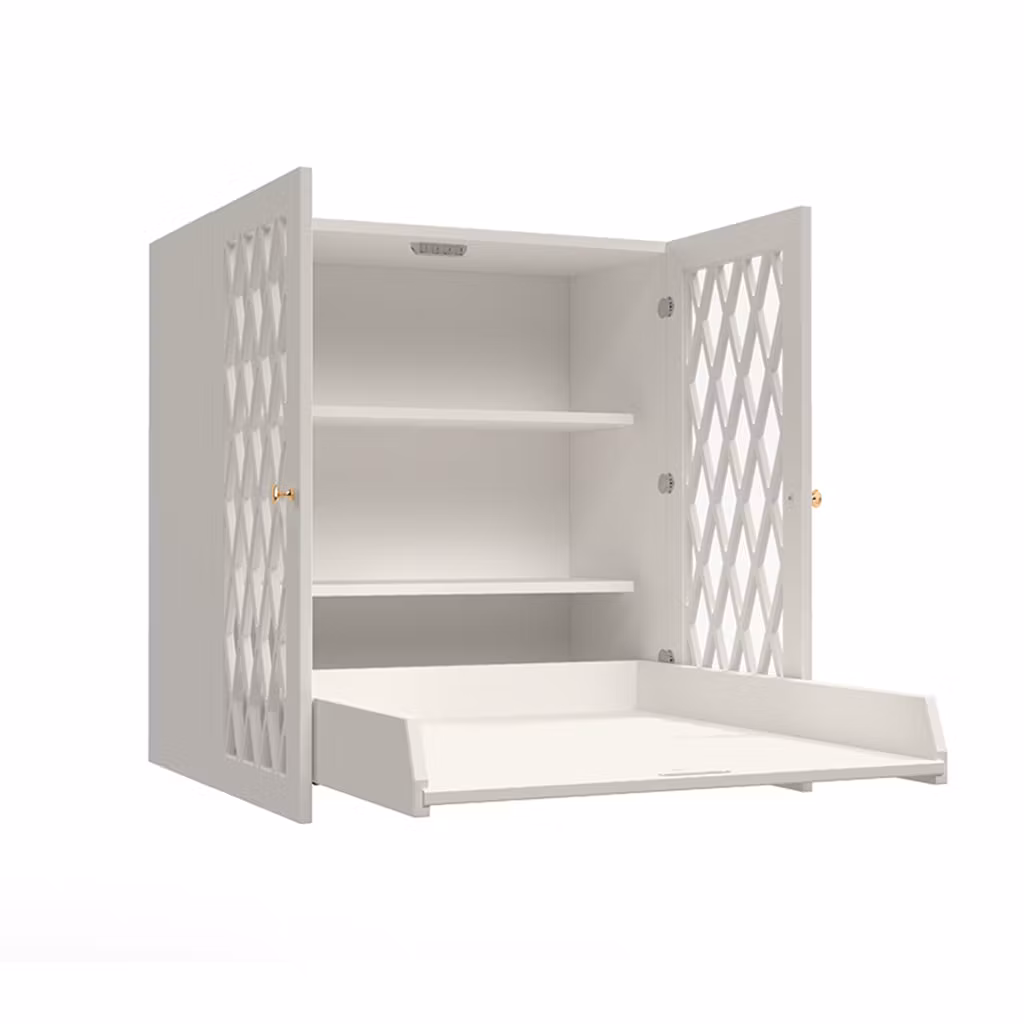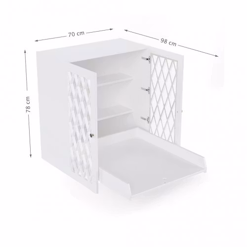 Skabet har dobbeltdør og praktiske hylder med plads til bleer og andet. Tilpasset til små rum, da puslebrættet foldes ned, når det er i brug og foldes op igen, når det ikke er i brug. Puslebordet kan senere bruges som overskab, da puslebordet nemt kan tages af, når bleskiftetiden er forbi.