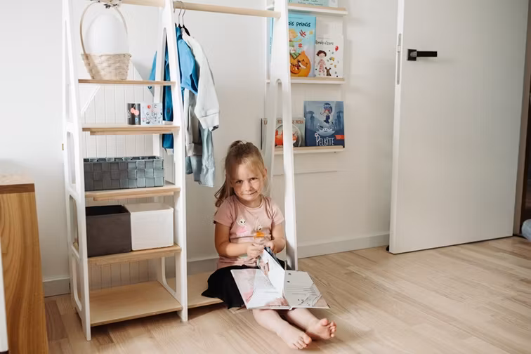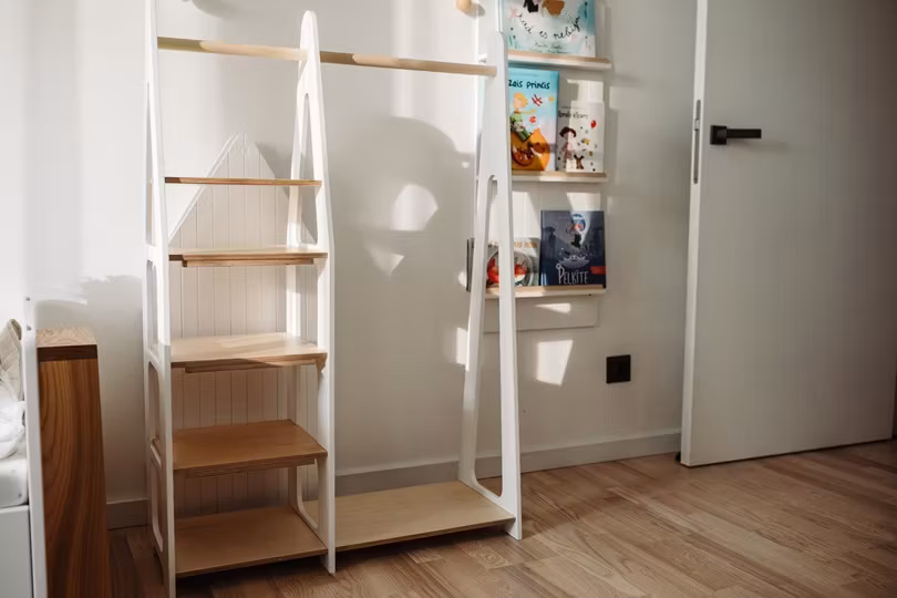 Garderobeskabet består af en tøjstang og hylder. Barnet vil få følelsen af at træde ind i deres garderobe og selv vælge dagens outfit eller hvorfor ikke bruge garderobeskabet som opbevaring af dit barns yndlingslegetøj?
