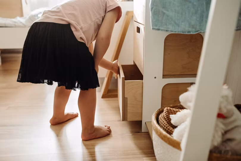 Garderobeskabet består af en tøjstang og tre kasser. Barnet vil få følelsen af at træde ind i deres garderobe og selv vælge dagens outfit eller hvorfor ikke bruge garderobeskabet som opbevaring af dit barns yndlingslegetøj?