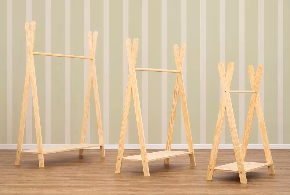 Garderobeskabet består af en tøjstang og en hylde. Barnet vil få følelsen af at træde ind i deres garderobe og selv vælge dagens outfit eller hvorfor ikke bruge garderobeskabet som opbevaring af dit barns yndlingslegetøj?