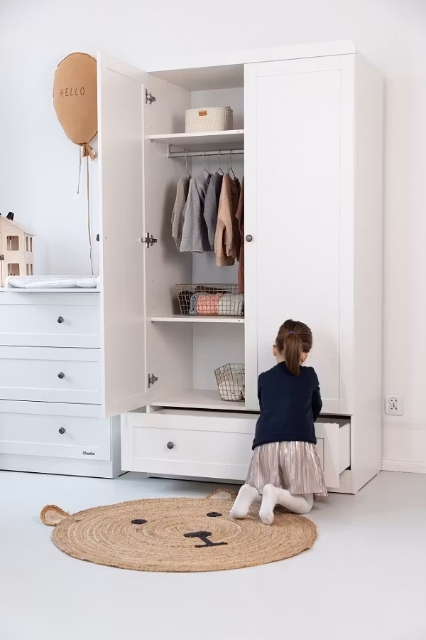 Garderobeskabet har en dobbeltdør med lydløs soft close, to justerbare hylder og en praktisk skuffe i bunden.