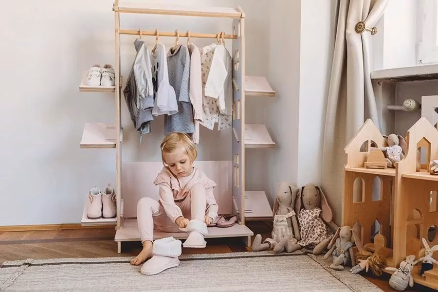 Med en stabil højde på 120 cm får barnet følelsen af at træde ind i sin garderobe og selv vælge dagens outfit eller hvorfor ikke bruge garderoben som opbevaring til dit barns yndlingslegetøj? Består af en bøjlestang og flere skostativer.