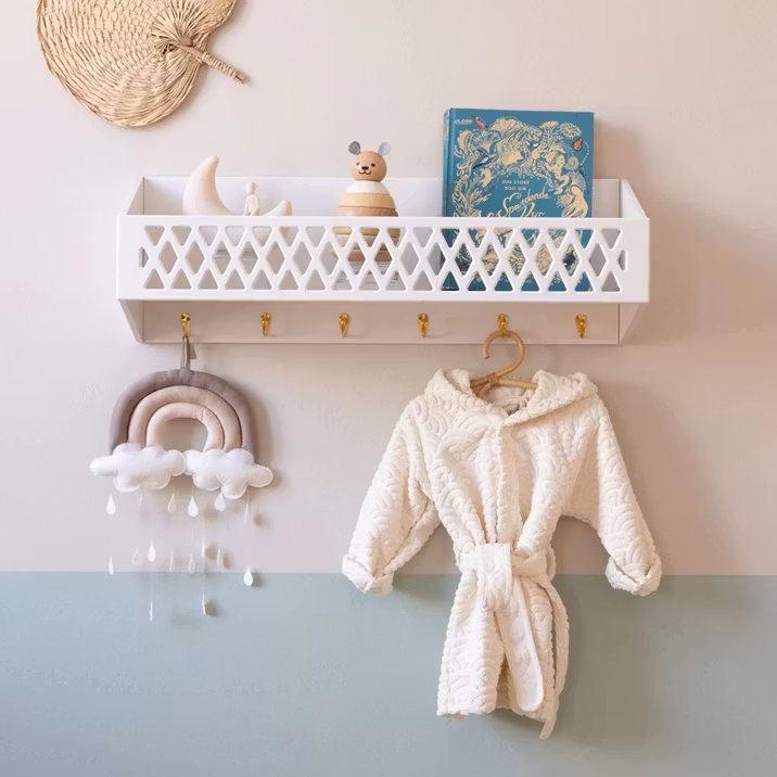 Vi mangler ord for denne stilfulde hylde med knager fra danske Cam Cam Copenhagen! Placer alle dit barns yndlingsting eller hvorfor ikke placere yndlingstøjet det bedste sted? Du hænger simpelthen denne hylde på væggen.