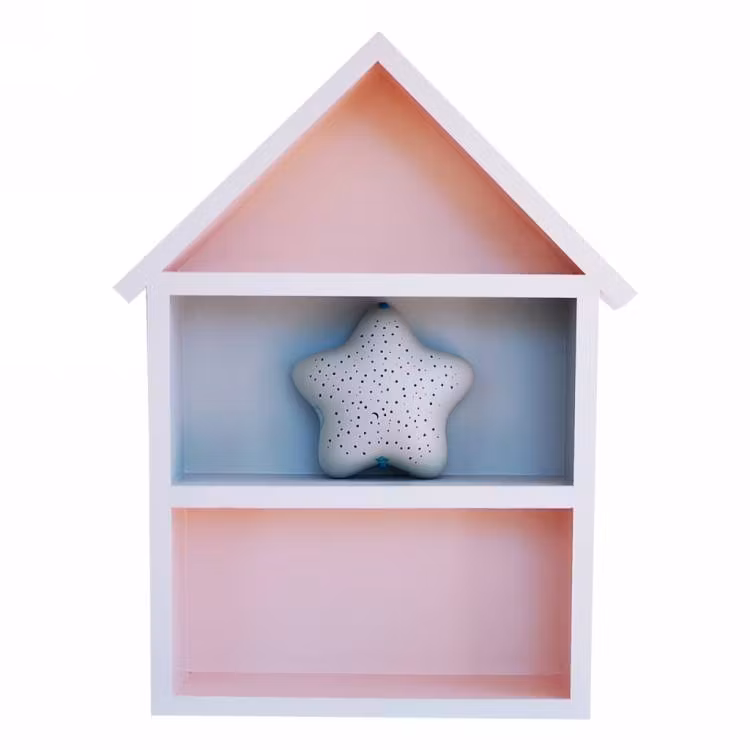 Hylden fungerer som bogreol, eller til opbevaring af legetøj og sættes nemt fast på væggen. Hushylden er desuden nem at holde ren. Hylden er lavet af fyrretræ og holder længe. Farven er velegnet til børns legetøj og giver sikkerhed for barnet.