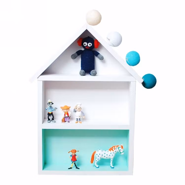 Hylden fungerer som bogreol, eller til opbevaring af legetøj og sættes nemt fast på væggen. Hushylden er desuden nem at holde ren. Hylden er lavet af fyrretræ og holder længe. Farven er velegnet til børns legetøj og giver sikkerhed for barnet.