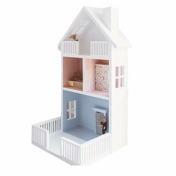 Et stort og flot dukkehus med altan og en smuk skorsten, der skaber ekstra charme.