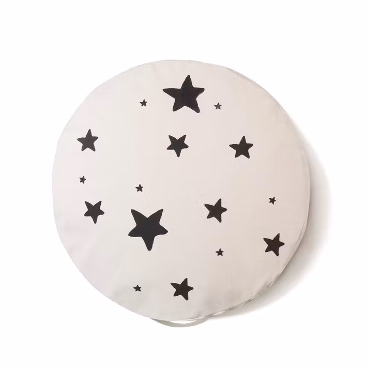 Det er håndlavet i Europa og materialet har ikke været udsat for nogen kemiske processer og indeholder ingen silikone. Printet er vandbaseret med en speciel serigrafimetode. Inderposen indeholder et fyld af polypropylen, som er et perfekt materiale til en puf, da den let former sig efter kroppen og kroppens position.