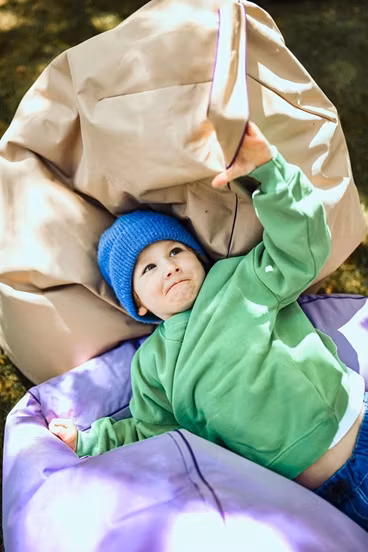 Nu kan dit barn slappe af på altanen, terrassen eller i haven i den behagelige sækkepose, der kan tåle sol, blæst, regn og endda sne.