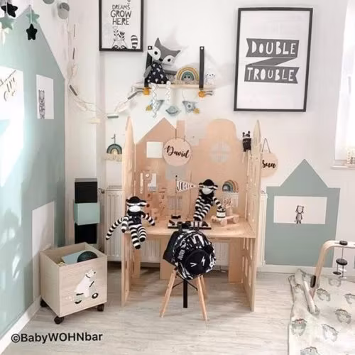 Med få enkle trin, helt uden værktøj, kan den bruges som skrivebord eller rumdeler. Et unikt produkt med mange anvendelsesområder, der kan bruges i mange år i takt med at barnets interesser ændrer sig.