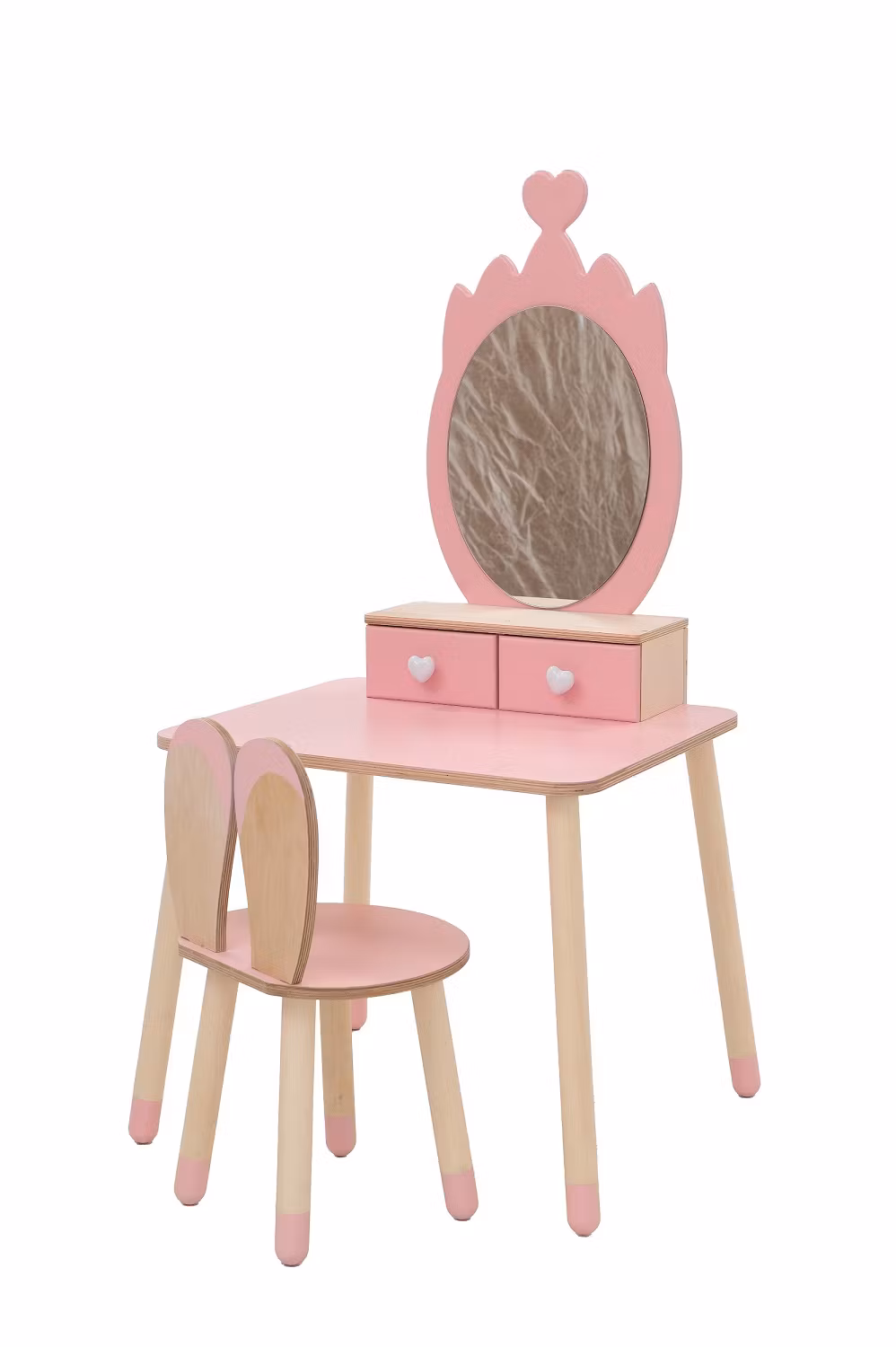 Oplev en verden af fantasi og glamour med dette fortryllende møbelsæt. Sættet består af en stol med kaninører og et smukt toiletbord med et spejl i form af en krone.