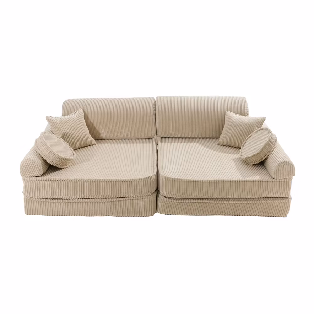 Møbelsættet består af en bygbar sofa med mange små puder. Børnesofaen kan foldes ud for at skabe en stor seng, når dit barn vil tage en lur, eller når venner sover. Skiller man de store puf ad, får man pludselig to behagelige lænestole! Eller hvorfor ikke bygge en hyggelig hytte?