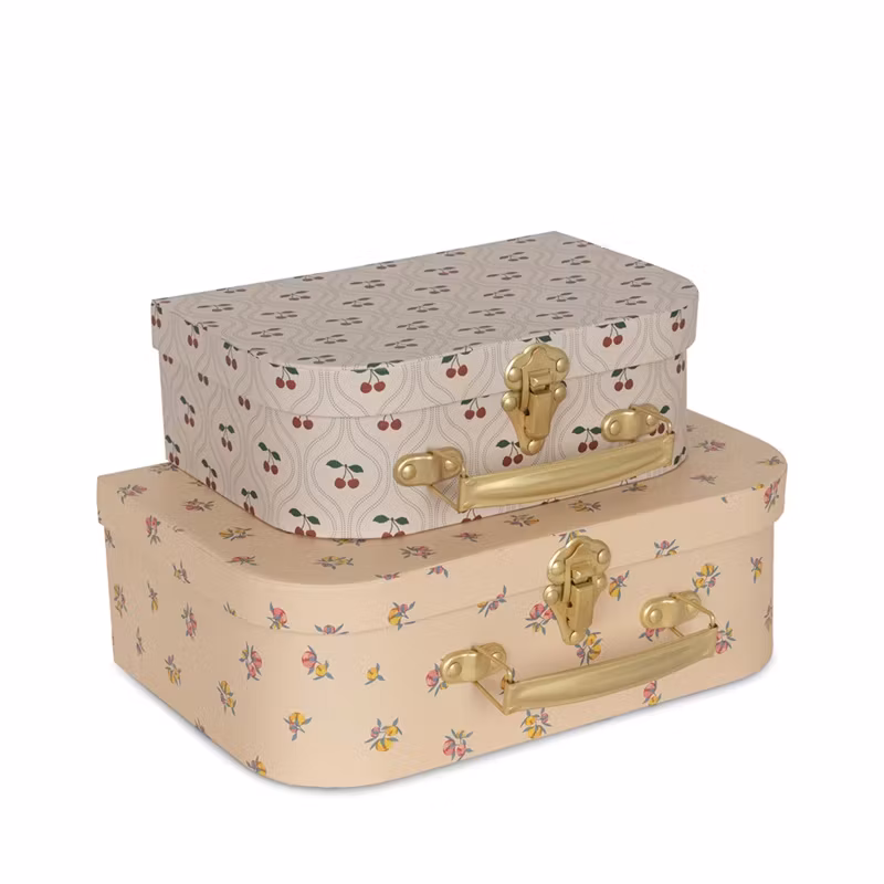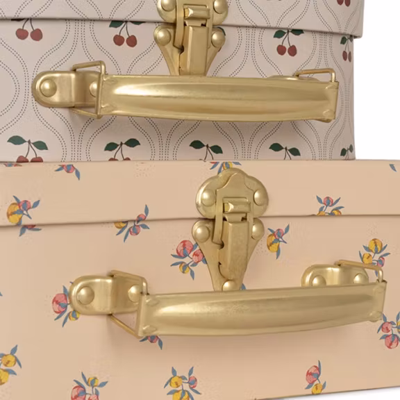 Opbevaringskasserne er lavet af hårdt pap med flotte metalhåndtag. Den lille kuffert passer i den store kuffert.