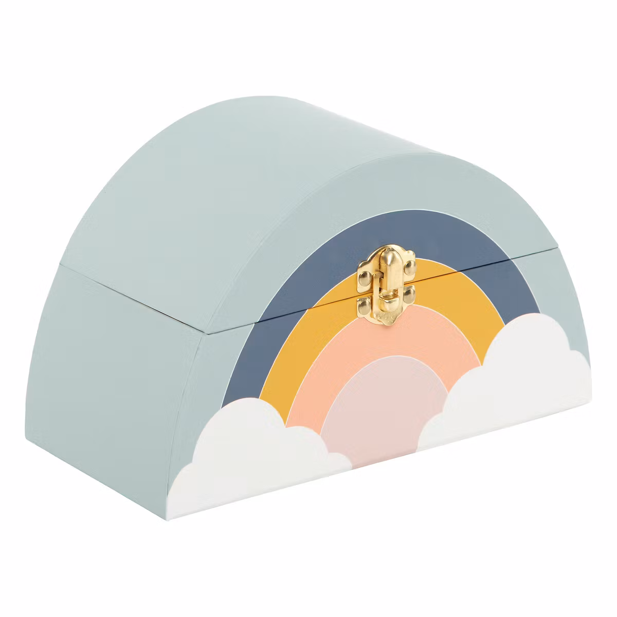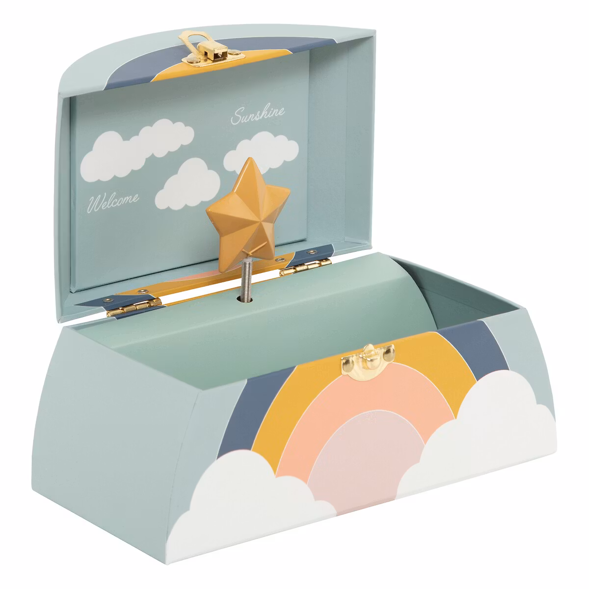 Vidunderlig og flot blå spilledåse i form af en regnbue. Dit barn vil synge med på Mozarts "Little Night Music".