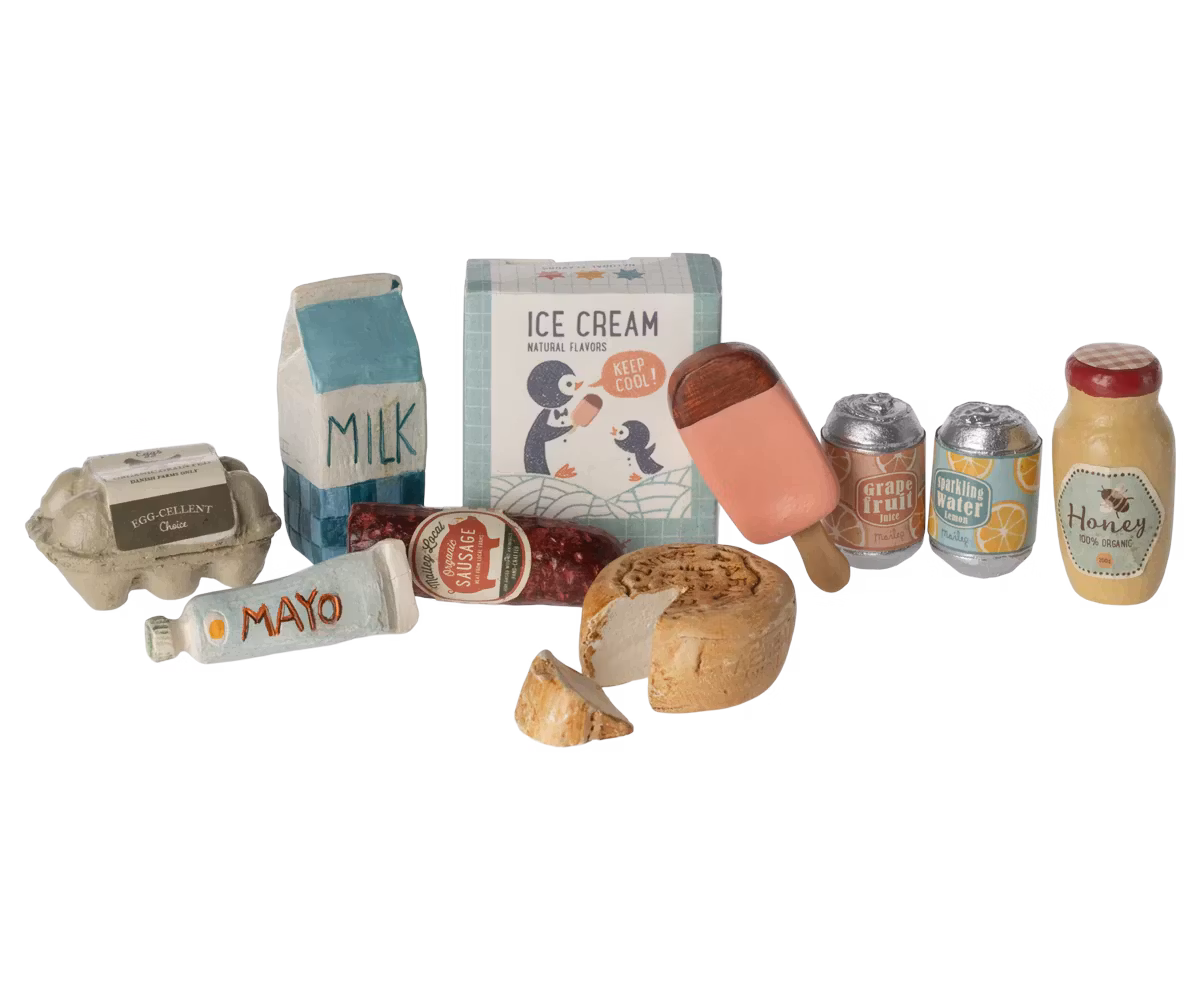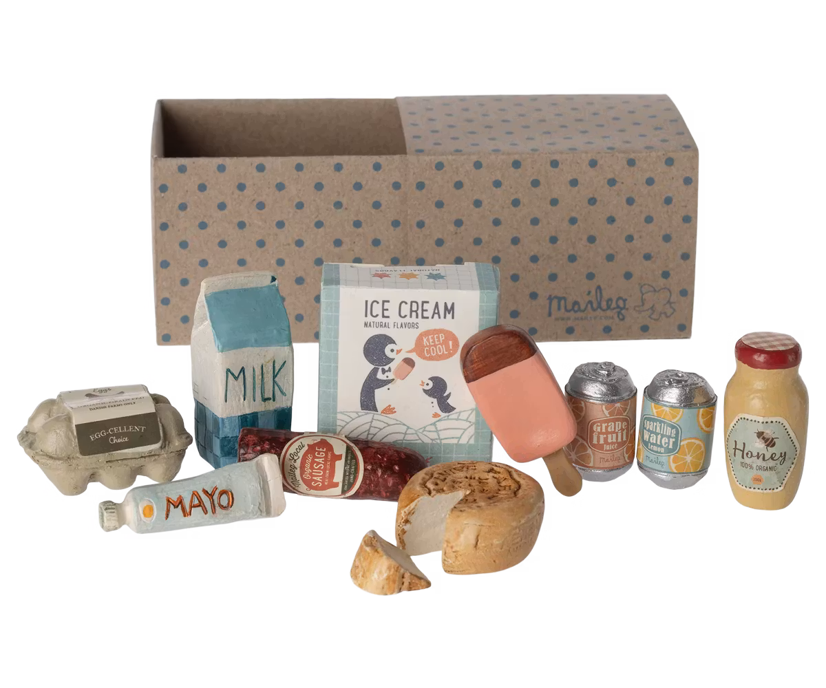 Du skal have noget mad inde i dukkehuset, ikke? Med denne fantastiske madpakke vil ingen være sultne om morgenen. Utroligt detaljeret produkt, der er fuldstændig håndlavet af det populære firma Maileg Boksen indeholder: mayonnaise, mælk, salami, honning, is, æg, honning 2 sodavandsdåser og ost. Alder: Fra 3 år. Materiale: Polyresin.