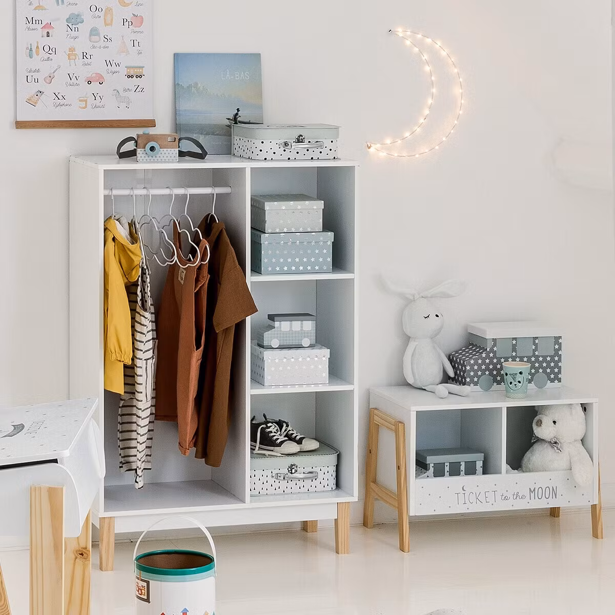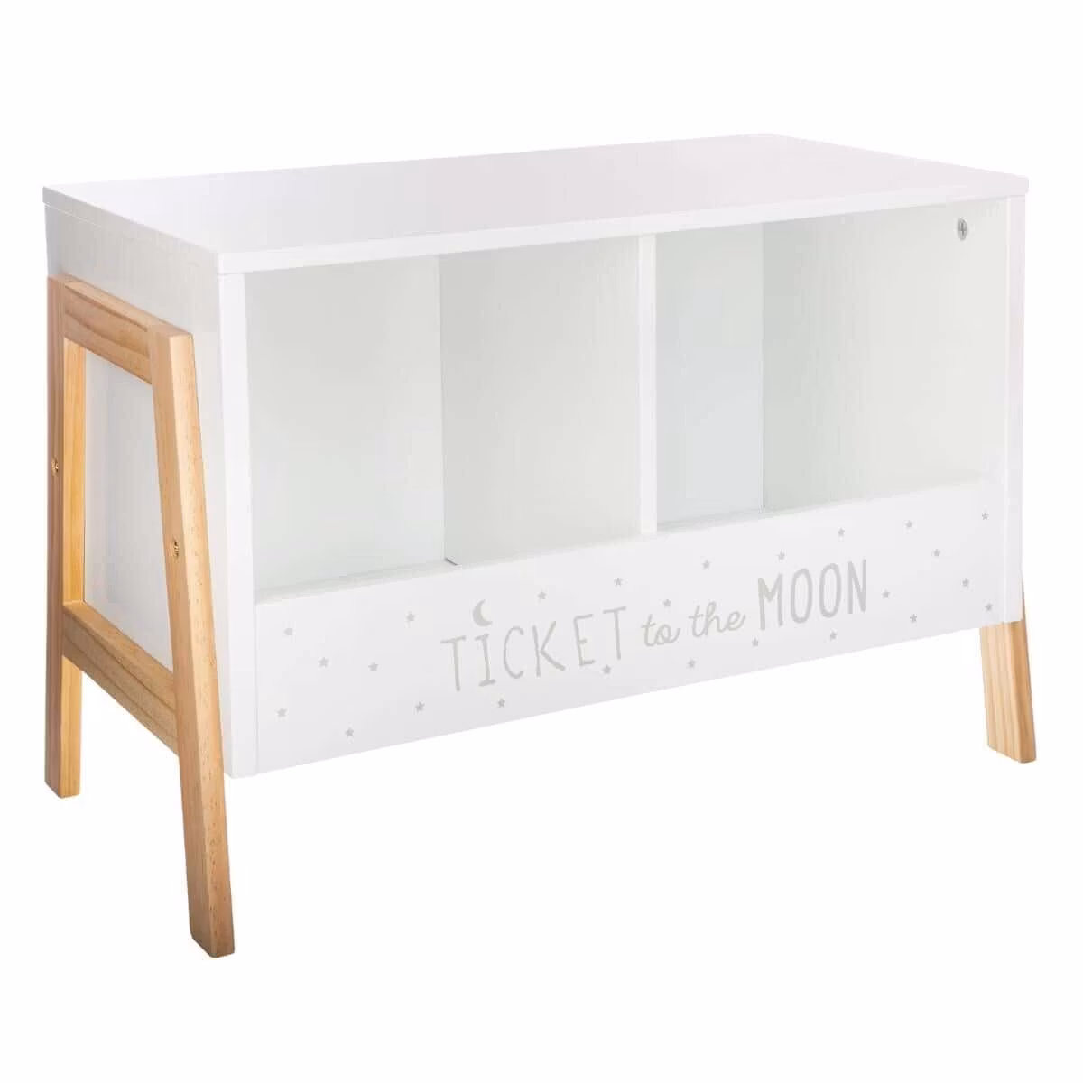 En smuk og enkel bogreol med to store rum med tekst på fronten, der tilføjer det lille ekstra til dit børneværelses indretning.
