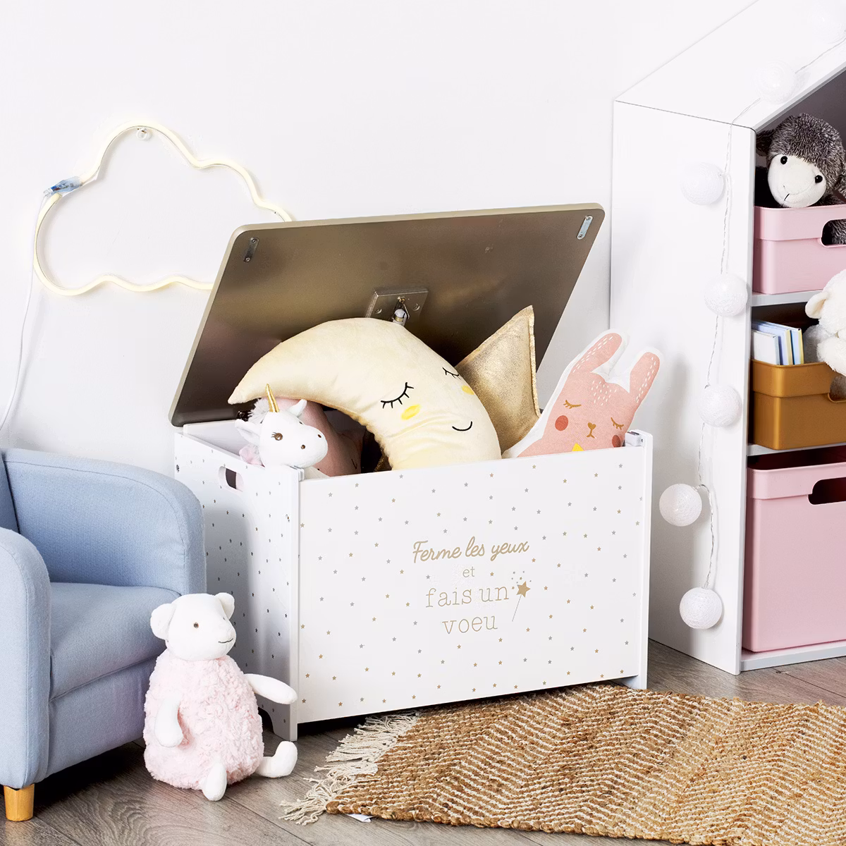 Smuk og samtidig praktisk bænk til opbevaring af dit barns yndlingsbøger og tøjdyr. Dekoreret med inspirerende tekst.