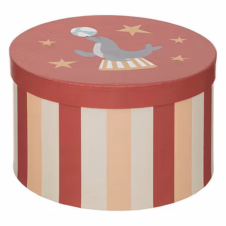 Sæt med 3 runde opbevaringsæsker med cirkusmotiv – både praktiske og legende!