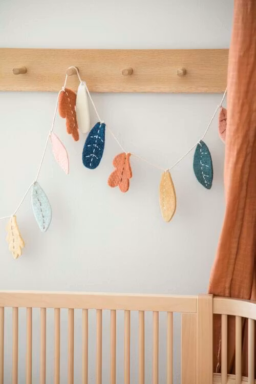 Håndlavet vimpel lavet af uld i forskellige farver fra danske Sebra. Denne smukke vimpelløkke med yndige stofvimpler er den perfekte detalje til indretningen af dit børneværelse.