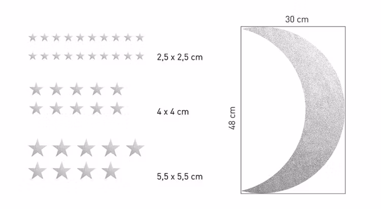 Størrelse: Måne: 48 cm x 30 cm, stjernerne i alt 39 stk. mellem 2,5-5,5 cm