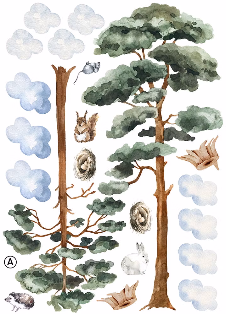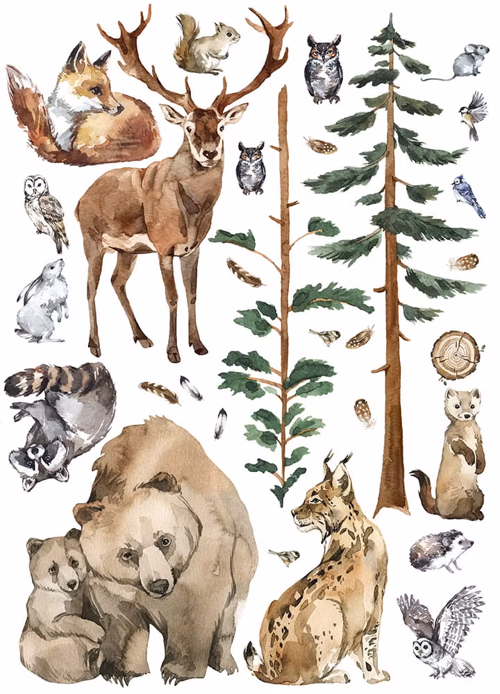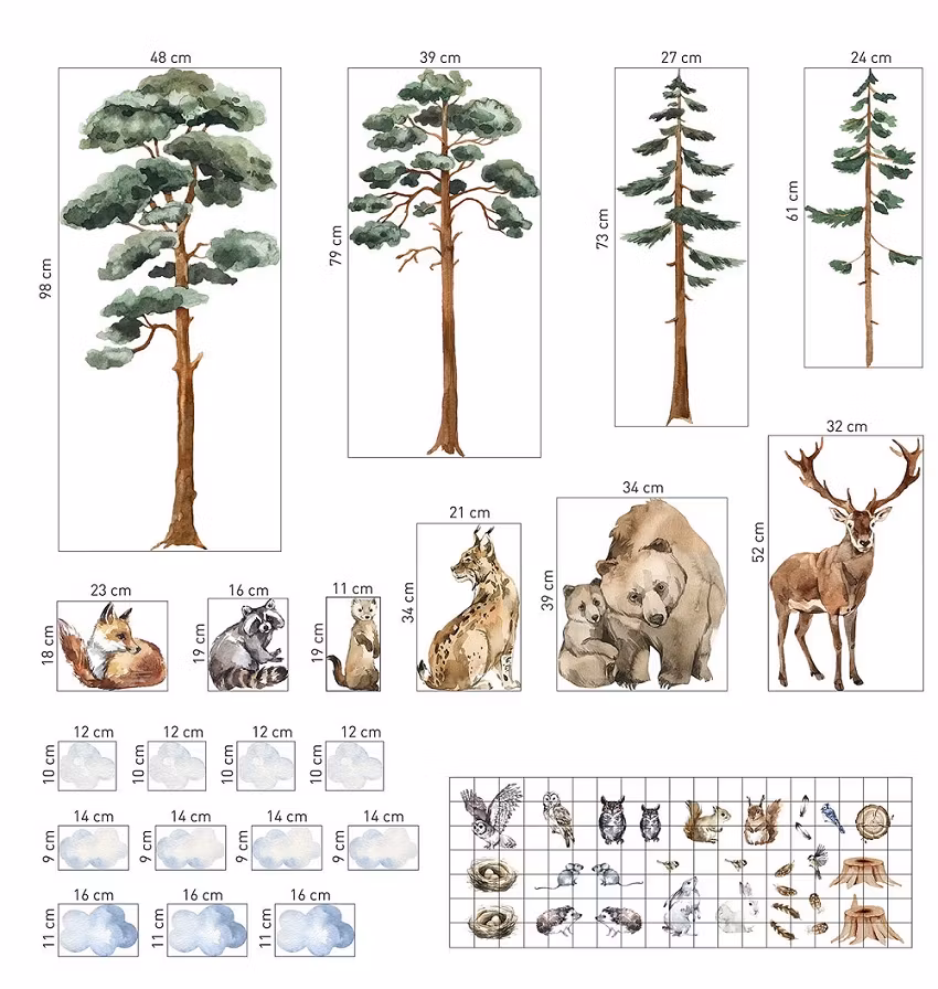 Et smukt sæt wallstickers i form af sjove skovdyr og graner.