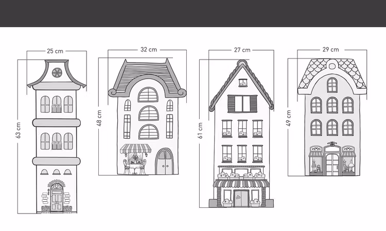 Mål: 4 stk. hus med højde mellem 48 cm - 63 cm og bredde 25 cm - 32 cm