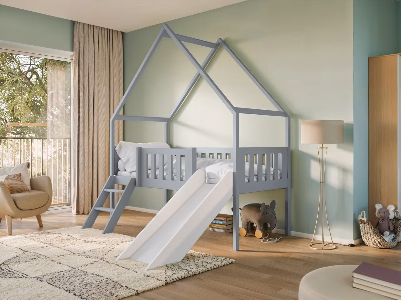 Velkommen til børneværelsets nye favoritmøbel! Denne vidunderlige husseng kombinerer tryg søvn med masser af legeinspiration. Med et stilrent og tidløst design bliver den hurtigt værelsets midtpunkt – og takket være den integrerede rutsjebane er det altid lidt sjovere at stå op!