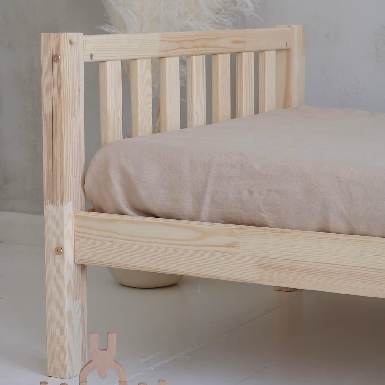 I forhold til massivt træ har fyrretræ den fordel, at det ikke knækker og ikke indeholder knaster, der påvirker dets udseende. En stabil og smuk seng af høj kvalitet!