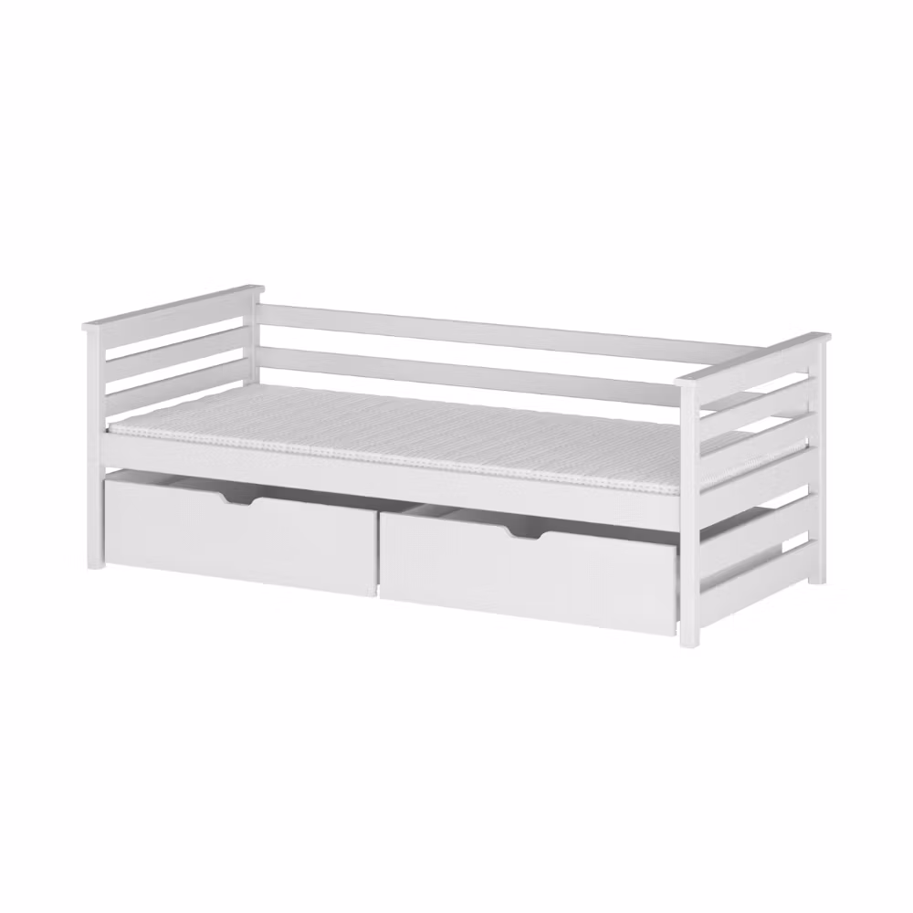 Sengene kommer fra vores fabrik i Europa, som har høje kvalitetskrav og kontrollerer hvert trin fra tømmeret kommer ind på fabrikken, til et færdigt produkt går. Malingen er organisk, vandbaseret og overholder standarden EN 71-3:2019.