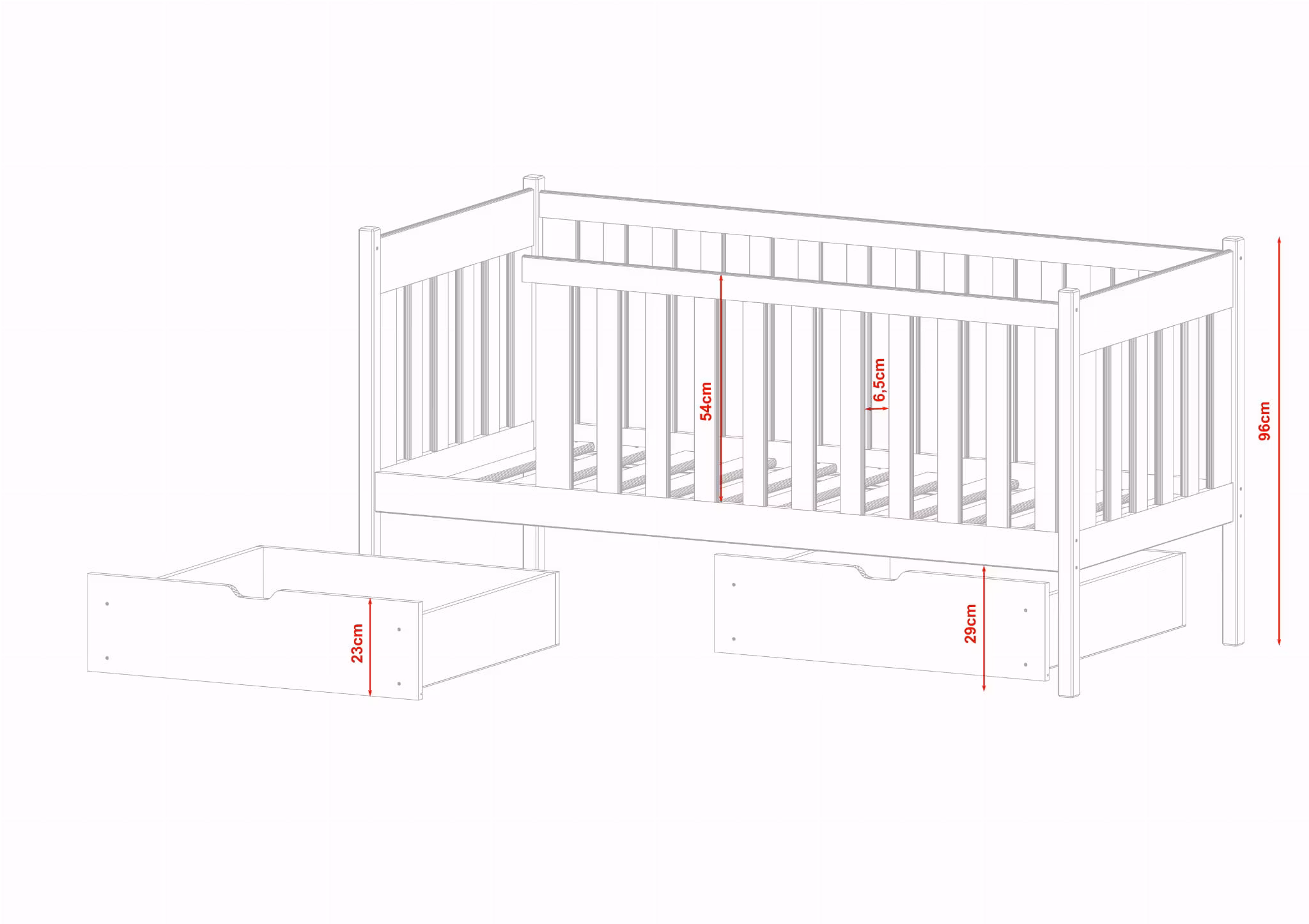 - Gelænderet/tremme: vælg uden eller med. Kan bestilles i tre forskellige længder: 1/2 af sengens samlede længde, 3/4 af sengens samlede længde og den fulde længde.