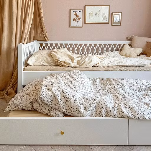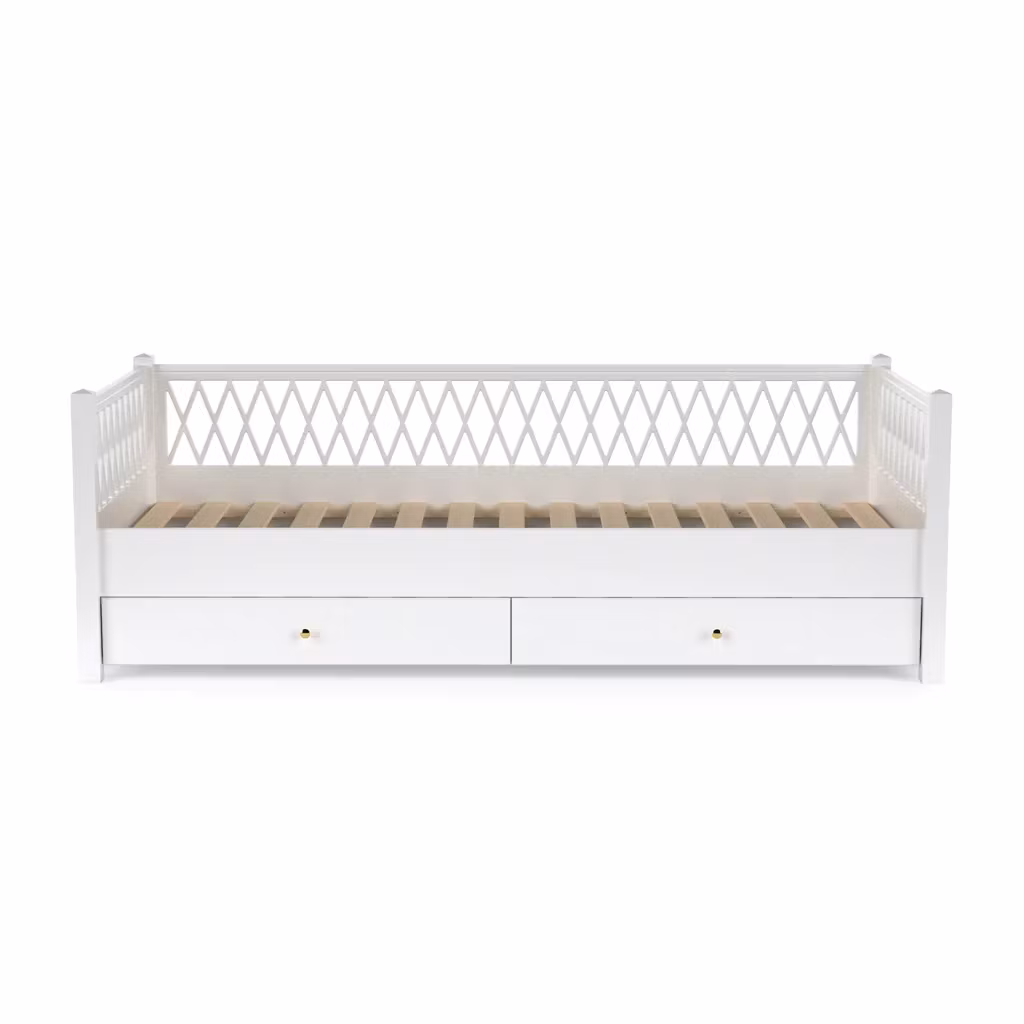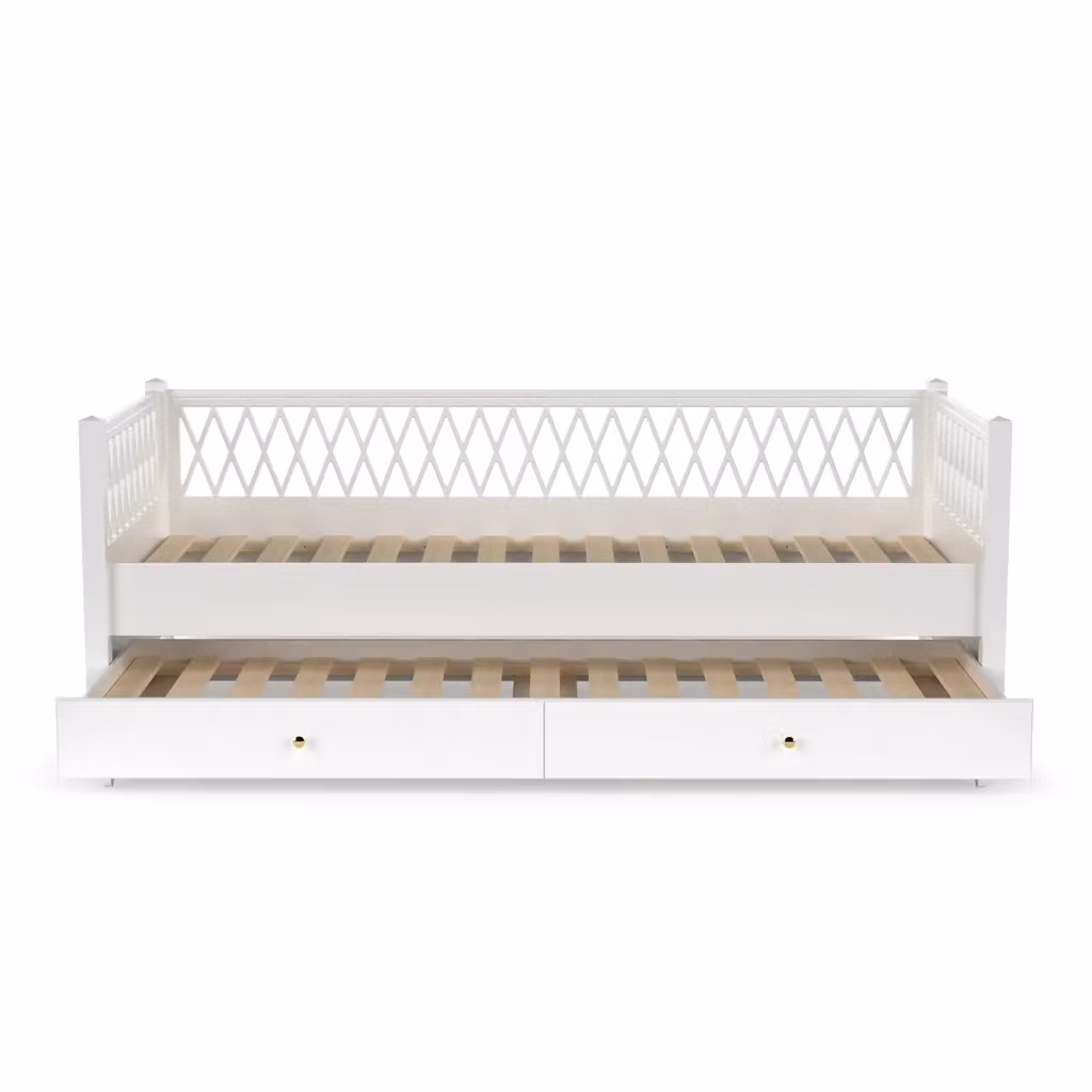 Til denne skønne seng kan du vælge enten to opbevaringsbokse eller en ekstra seng. Opbevaringsskuffer med soft close er perfekte til familier, der har brug for ekstra opbevaring, og den ekstra seng vil forvandle sengen til en perfekt søskendeseng. Vælger du en ekstra seng, medfølger en ekstra lamelbund.