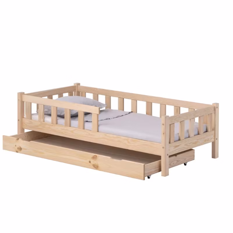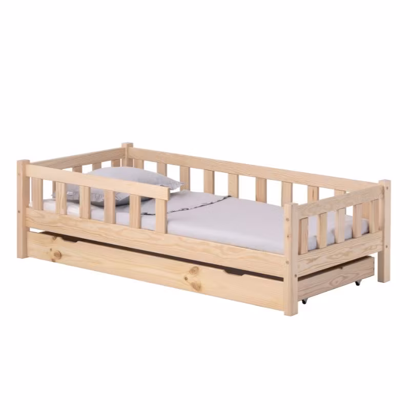I forhold til massivt træ har fyrretræ den fordel, at det ikke knækker og ikke indeholder knaster, der påvirker dets udseende. En stabil og smuk seng af høj kvalitet!
