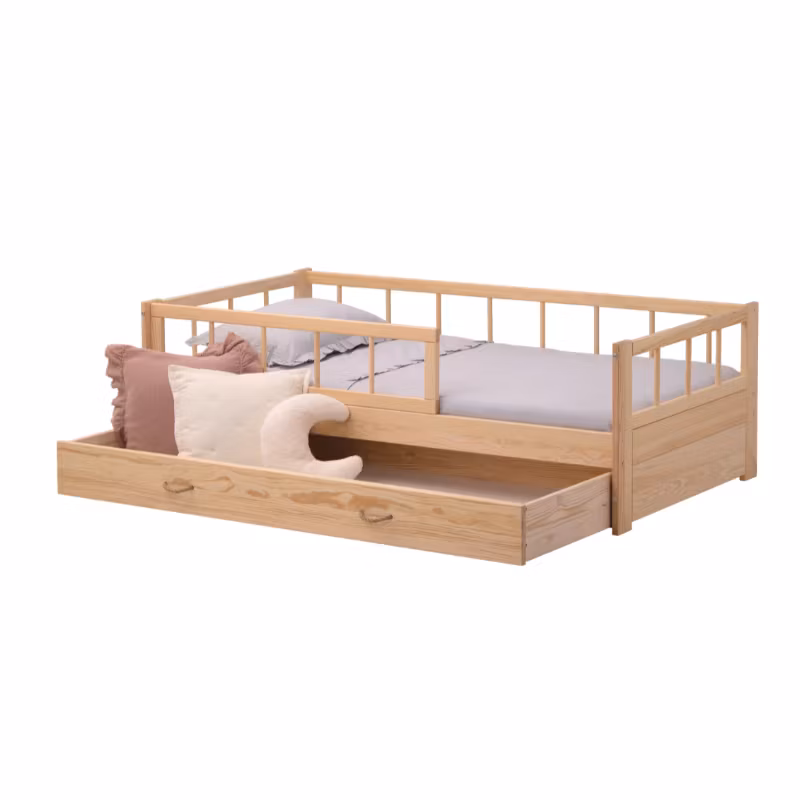 I forhold til massivt træ har fyrretræ den fordel, at det ikke knækker og ikke indeholder knaster, der påvirker dets udseende. En stabil og smuk seng af høj kvalitet!