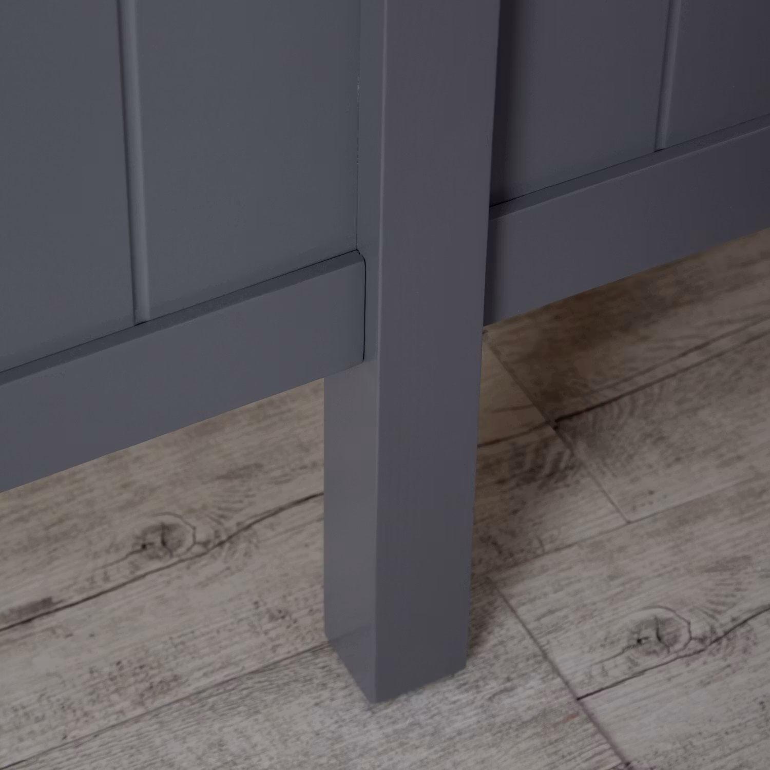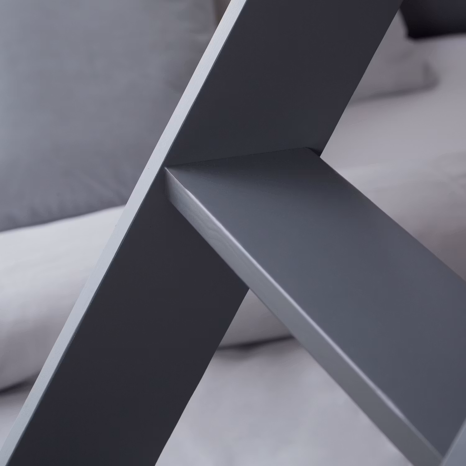 Sengen er malet i grå, men man har ladet træfibrene skinne igennem for at skabe en dejlig karakter på barnesengen.