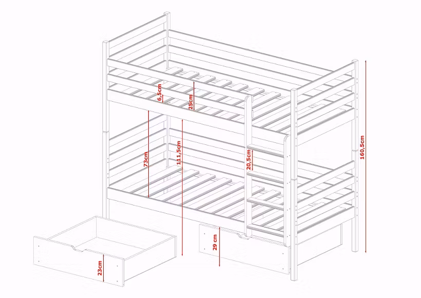 - Gelænderet og stigen på den øverste seng er aftagelig og kan monteres på enhver side.