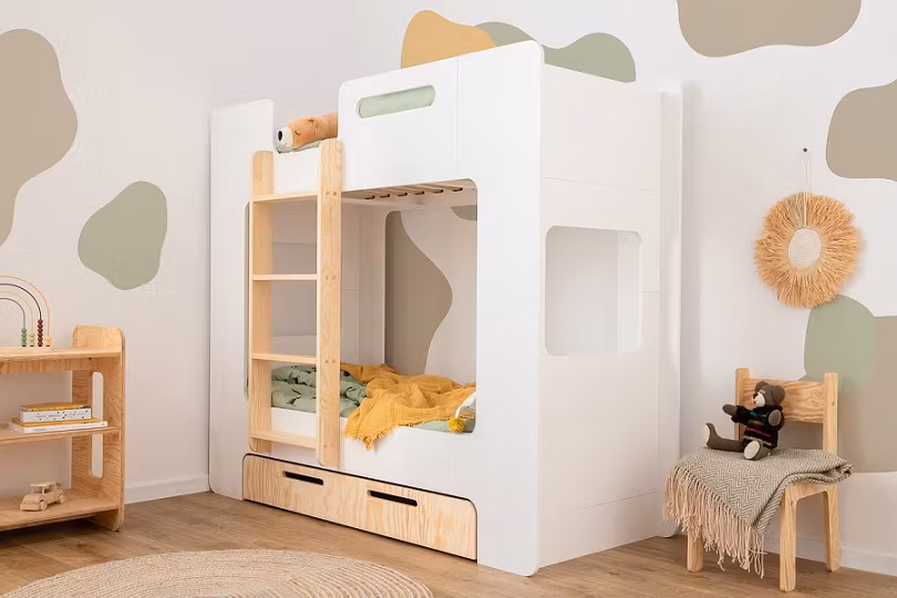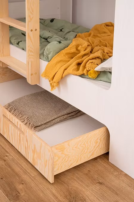 Denne fantastiske køjeseng og søskende seng Melker er håndlavet med stor passion i krydsfiner af høj kvalitet.
