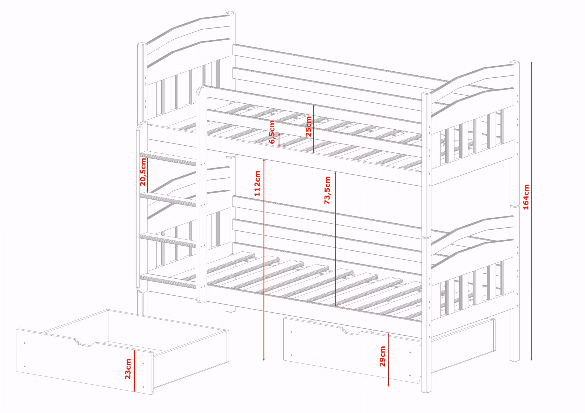 - Samlet højde på sengen: 164 cm.