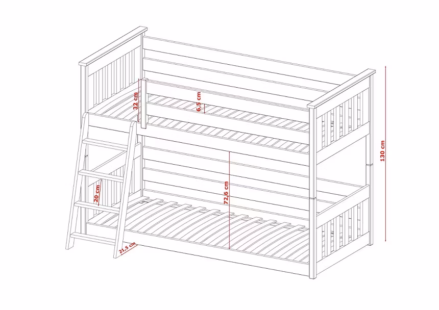 - Højde fra gulv til øverste seng: 72,5 cm.