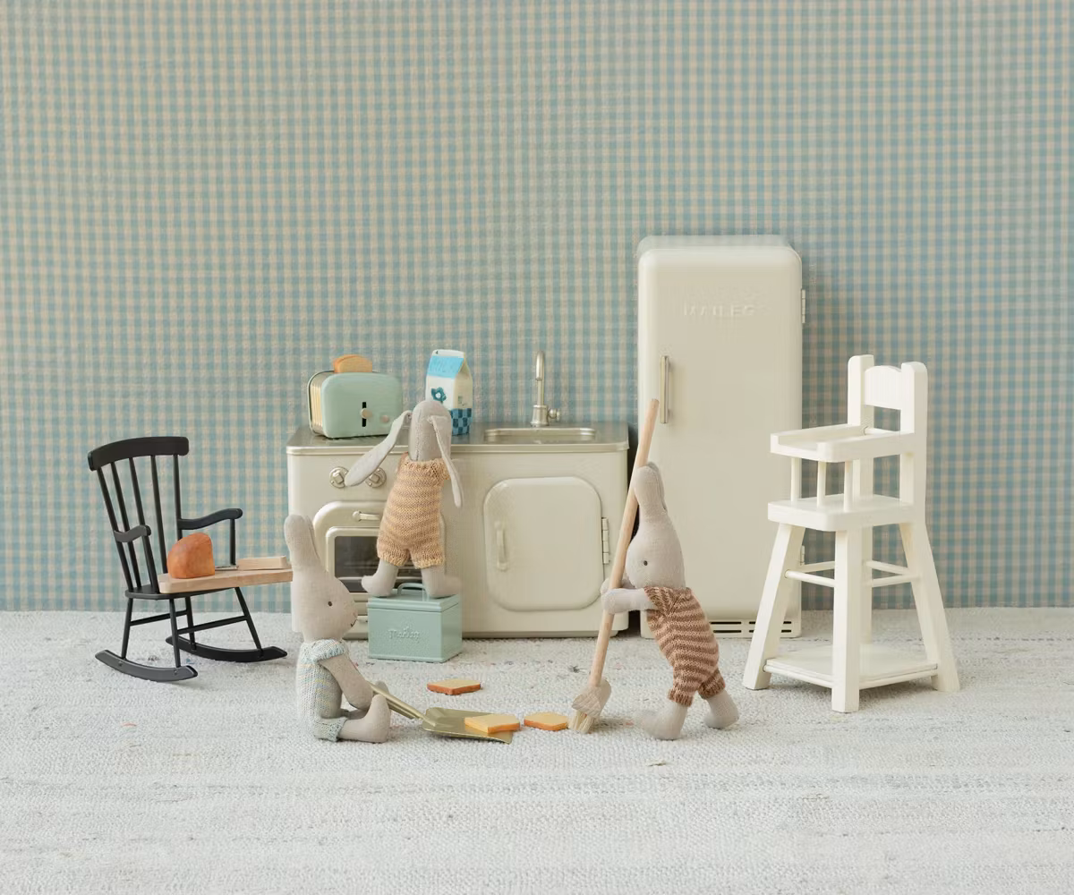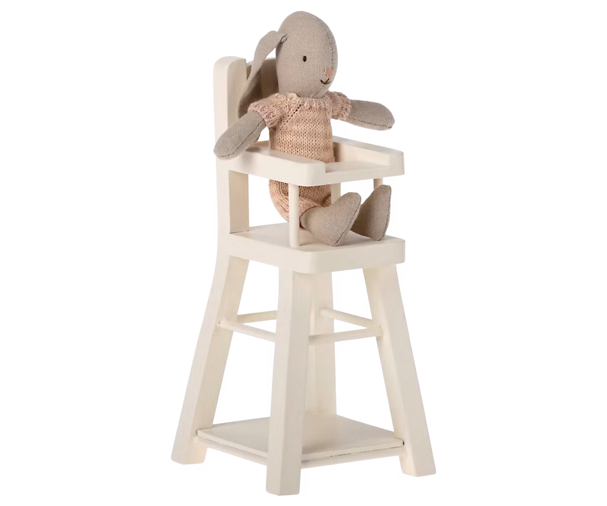 Den mindste af de mindste skaller kunne selvfølgelig også sidde behageligt ved køkkenbordet. En super lækker spisestuestol i hvid vil gøre dukkehuset endnu flottere. Utroligt detaljeret produkt fuldstændig håndlavet af det populære firma Maileg. Højde: 17 cm Alder: Fra 3 år. Materiale: Træ.