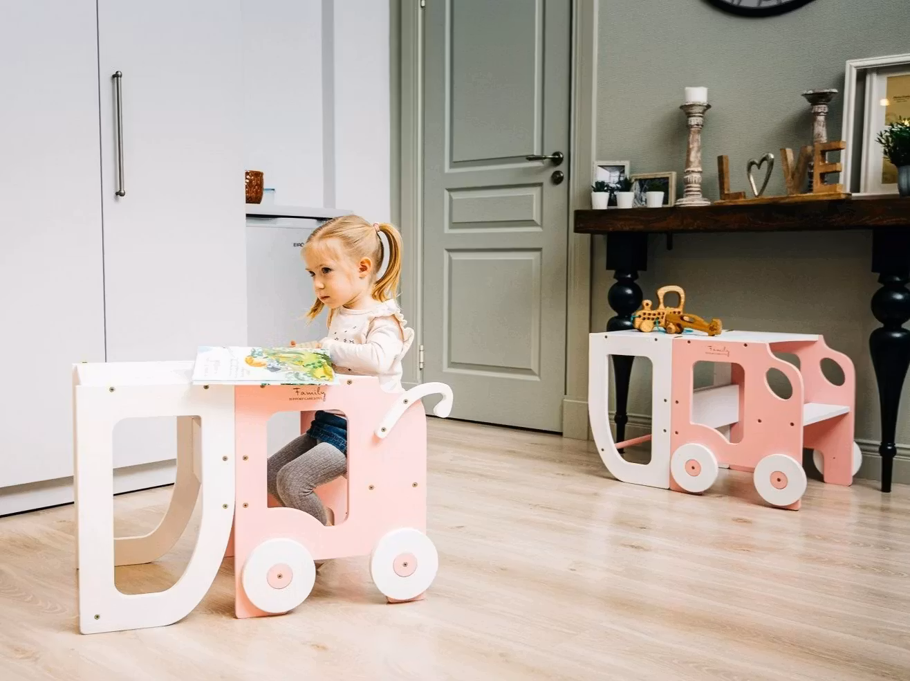Bygbar læringstårn taburet bil, lyserød/hvid