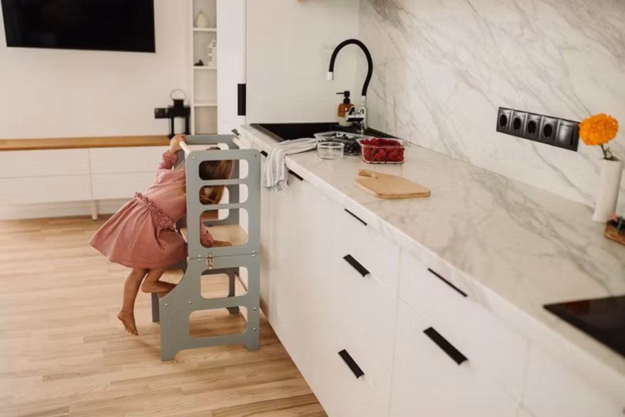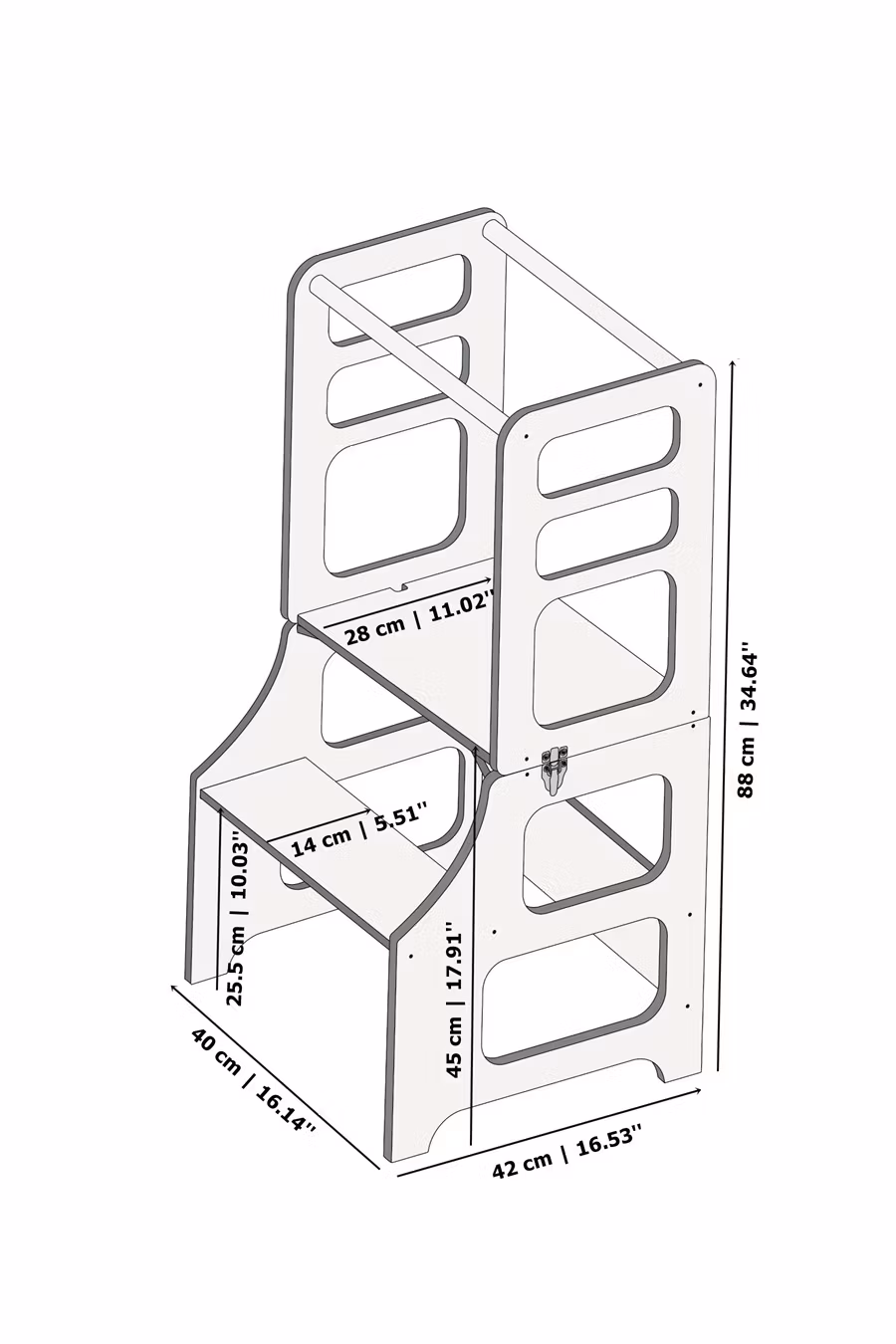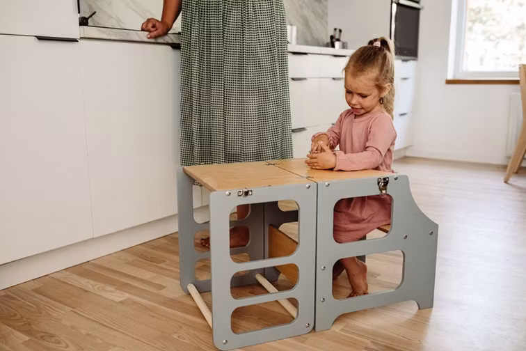 Hjælper, når barnet skal børste tænder, vaske hænder, assistere forældrene med madlavning eller andre aktiviteter, hvor den lille ikke helt kan nå. Kan også foldes sammen til et skrivebord med skammel. Rutsjebanen er let at fastgøre til skrivebordet og byder på mange timers leg.