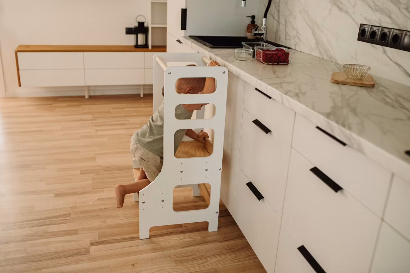 Aldrig før har det været nemmere stilfuldt at lade stjernekokkene tage deres plads i køkkenet! Når dit barn ikke bruger læringstårnet, folder du den blot sammen og sparer plads.