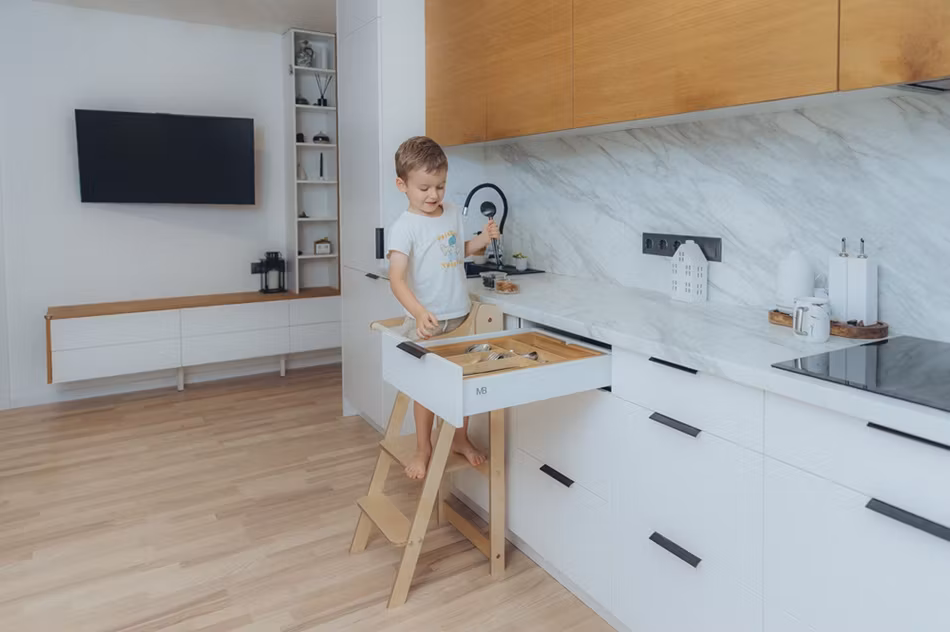 Aldrig før har det været nemmere stilfuldt at lade stjernekokkene tage deres plads i køkkenet! Når dit barn ikke bruger læringstårnet, folder du den blot sammen og sparer plads.
