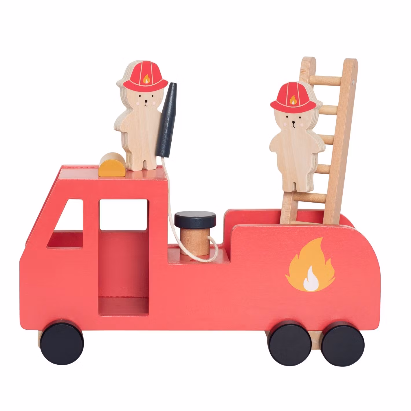 Brandbilens stige kan drejes vandret og lodret, så de to modige brandmænd kan klatre op ad stigen med brandslangen og slukke ilden. Når ilden er slukket, kan slangen rulles sammen og puttes i sin beholder.